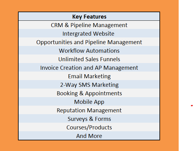 Our platform replaces the need for multiple subscriptions such as HubSpot, Pipedrive, ClickFunnels, Wix, Squarespace, WordPress, SurveyMonkey, Typeform, Wufoo, ActiveCampaign, Mailchimp, Podium, Twilio, Calendly, Acuity, Setmore, Zapier, Keap, Teachable, Thinkific, CallRail, Marchex, Birdeye, Reputation.com, Google Analytics, Mixpanel, Skool, Mighty Networks, Circle, DocuSign, and HelloSign — while also offering unique features available only through our Platform.